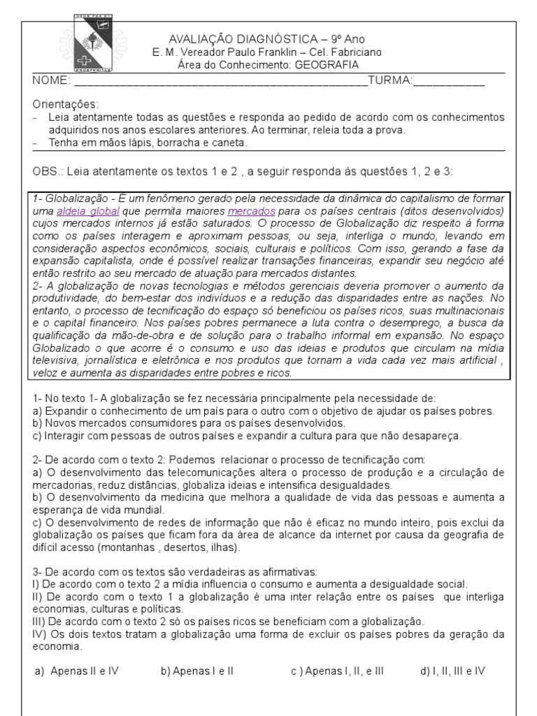 Diagnostico 9 Ano Pdf Globalizacao Africa